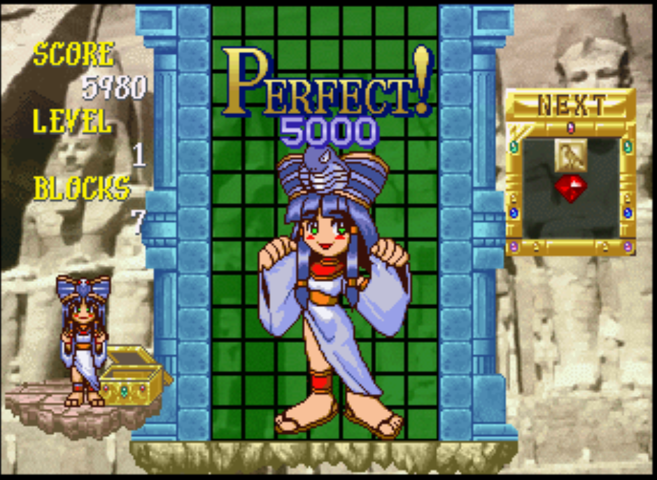 Taito was a powerhouse in the 1990s. Best-in-class shooters in Darius, unique experimental fighting games in Fighters Impact and Psychic Force, pursuing perfection in single-screen platformers with the Bubblun dragons and expanding on that clear-the-screen essence in Elevator Action Returns. Another place they were leading the pack in, though, was puzzle games. Some of their other entries I’ll keep secret for later. For now, let’s dive into the ancient Egyptian stone-tablet-and-rare-gem simulator Cleopatra Fortune.